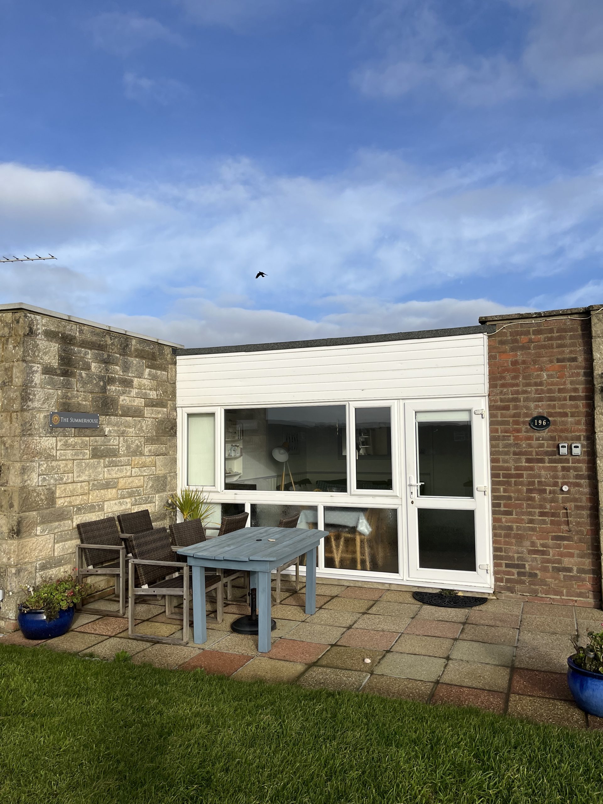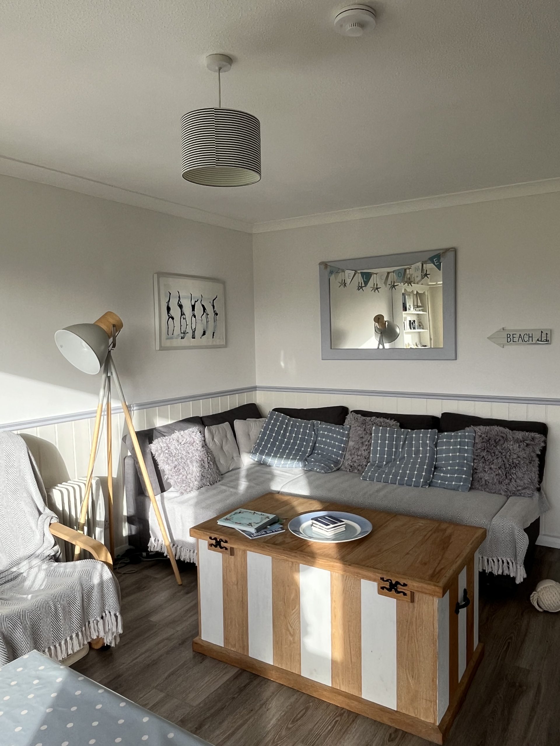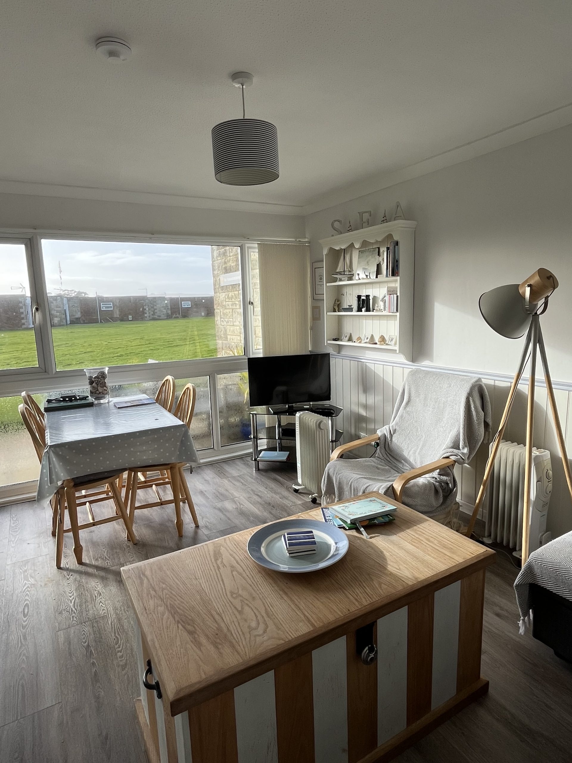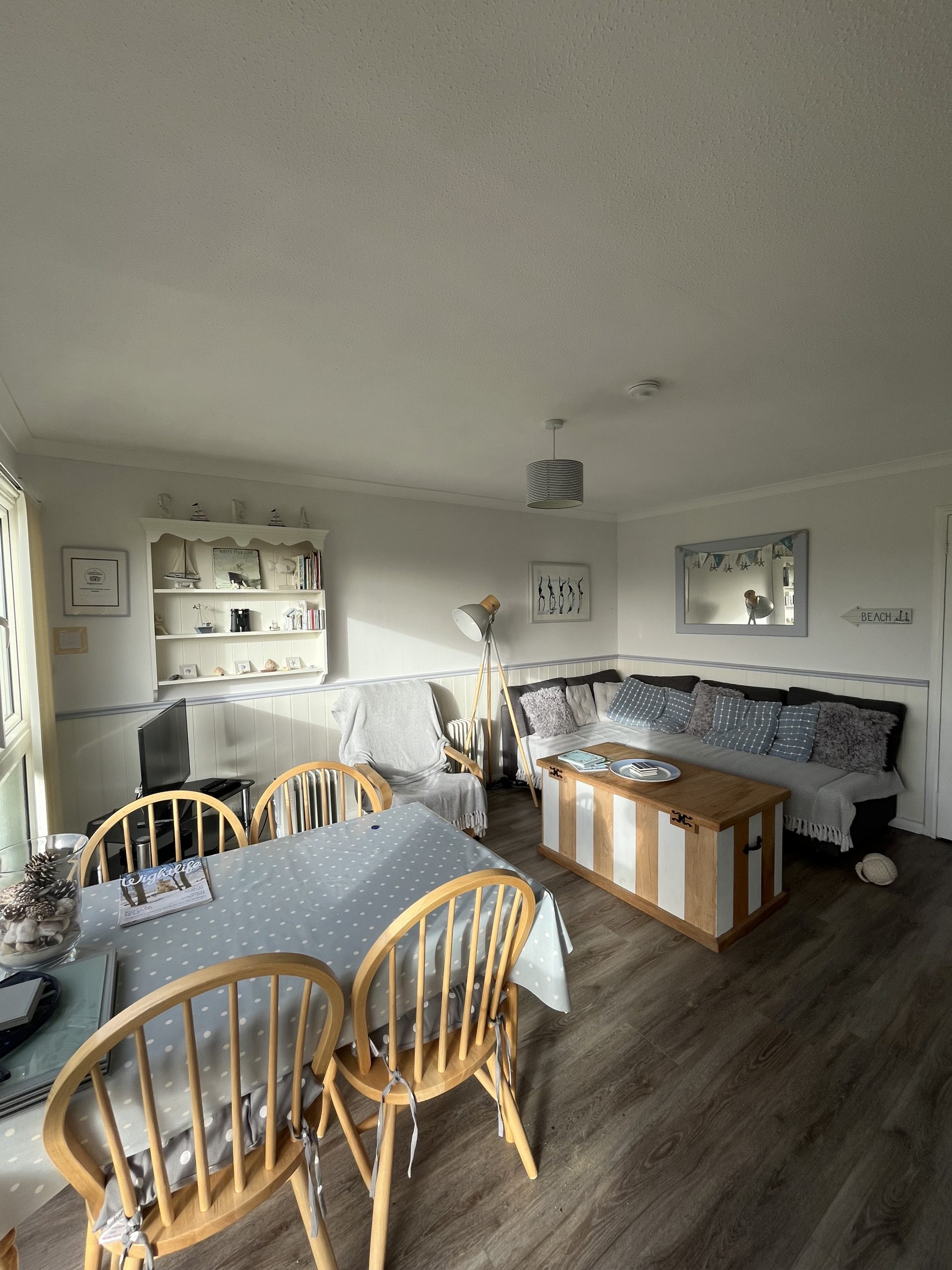 Light and modern lounge with a sofa, an armchair, Smart TV, DVD, and Radio/CD player. There are also a dining table with 4 chairs.
