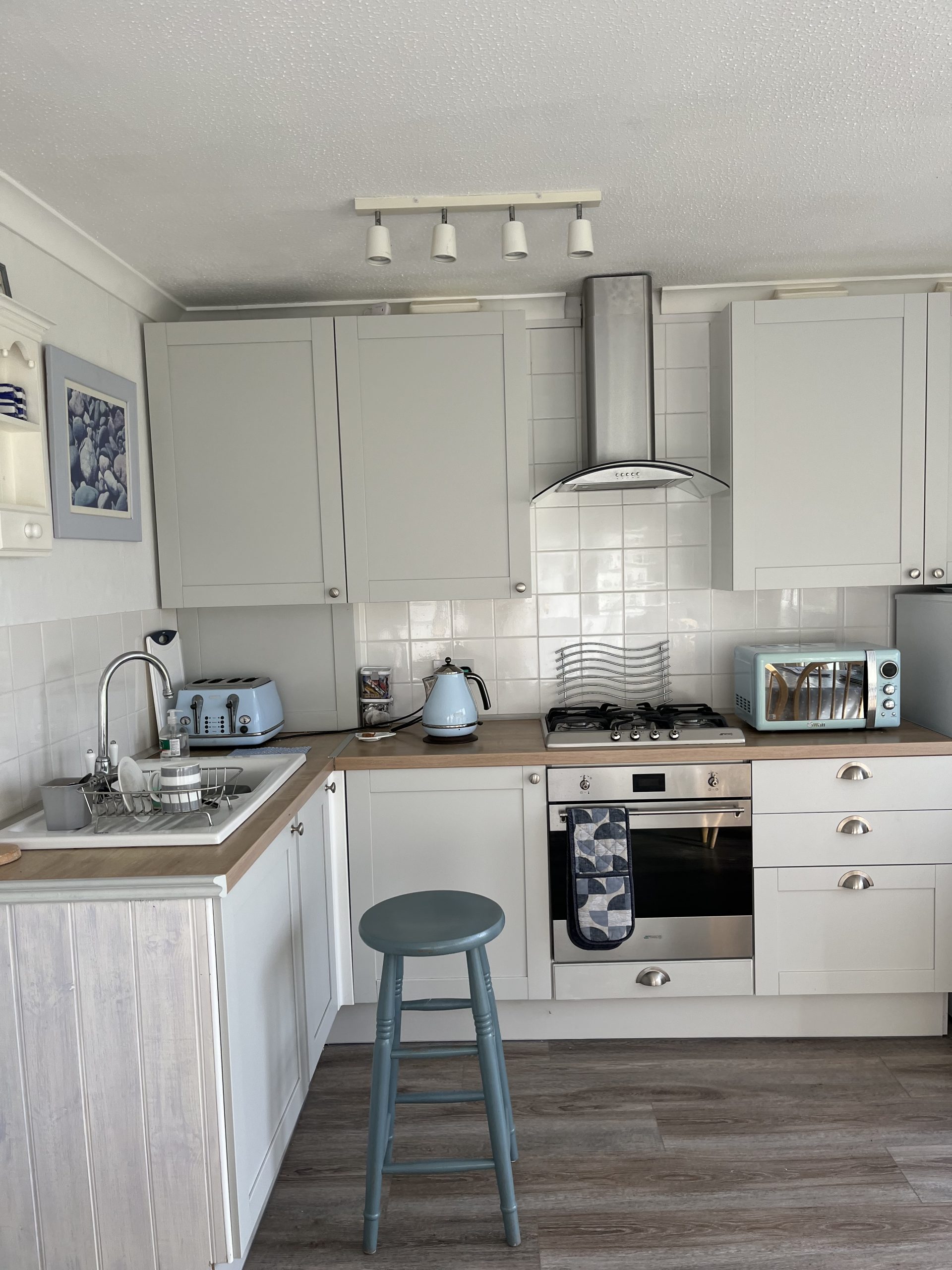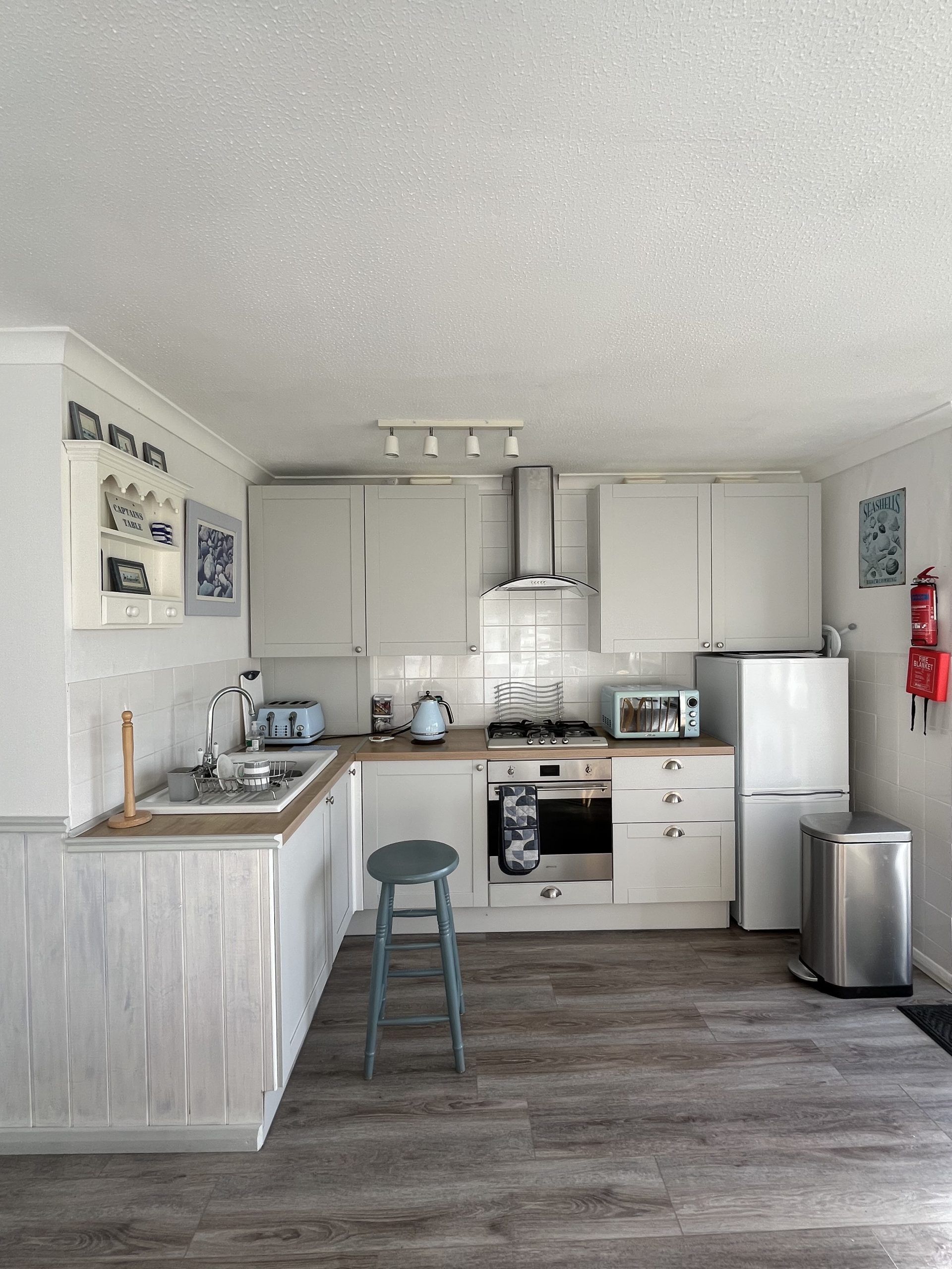 Open plan kitchen, fully equipped (stove with oven, microwave, fridge-freezer, kettle, all necessary cutlery and crockery)